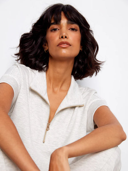 Elevate your everyday style this spring with our Heather Light Grey Soft Scuba Top. Featuring a chic half-zip mock neck, short sleeves, and playful white blanket-stitch detailing, this versatile top pairs effortlessly with any bottoms for a polished, effortless look.