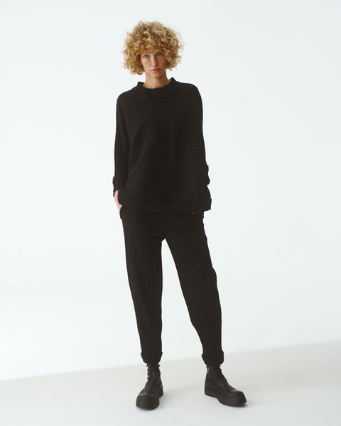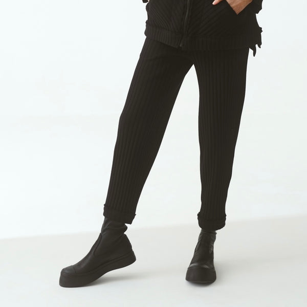 A weighted cotton knit pant featuring an elastic waist, pockets, ribbed detail, and cuffed bottom. Perfect for lounging around during colder months or staying cozy but chic while out and about.