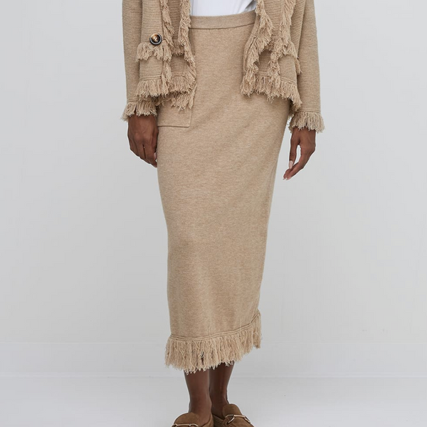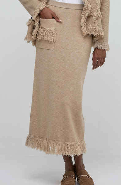 Fitted midi knit skirt with funky front fringe pocket and fringe hem detail.