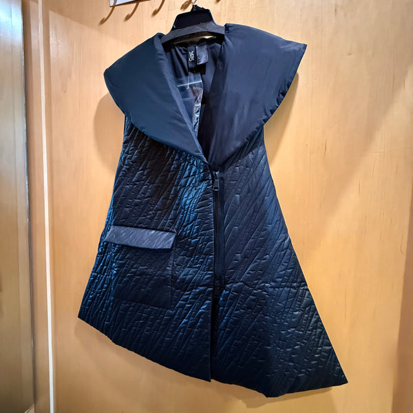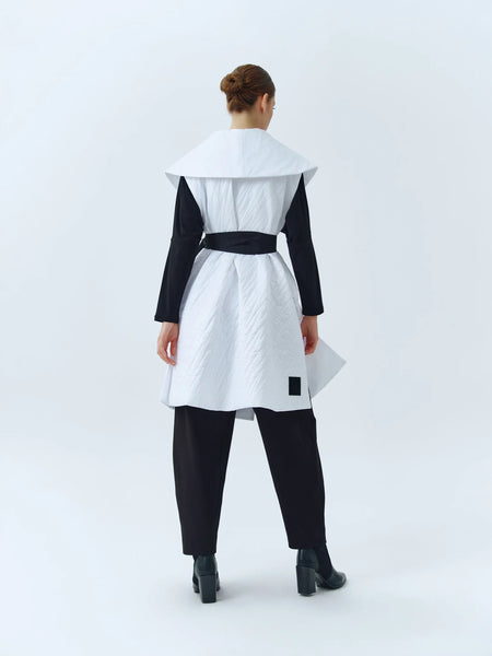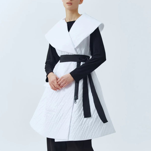 Black, lightweight puffer W-coat, with wide overlapping collar, one patch pocket, side slits and an optional waist-wrapping black ribbon. Exposed zipper fastening. A fashionable but functional style.